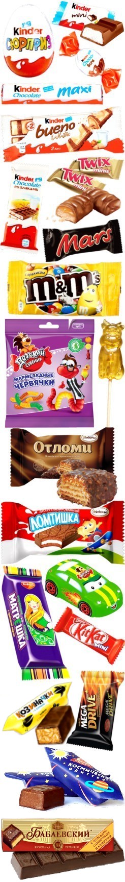 Шоколадка "Аленка" (1 шт), Жареный арахис с карамелью (1 шт), Ирисный батончик (1 шт), Фруктовое желе в шоколаде (1 шт), Мягкий грильяж (1 шт), Трюфели (1 шт), "Ореховая роща" (1 шт), Конфеты "Мишка косолапый" (1 шт), Конфеты "Петушок" (1 шт), Конфеты "Нива" (1 шт), Конфеты "Маска" (1 шт), Конфеты "Аленка"  (1 шт), Конфеты "Кара-кум" (1 шт), Конфеты "Toффи" (1 шт), Конфеты "Ну-ка отними" (1 шт)
